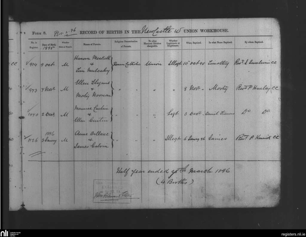Newcastle Union Workhouse; County of Limerick; Diocese of Limerick. Baptisms, Oct. 1895 to Jan. 1896