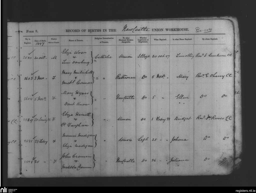 Newcastle Union Workhouse; County of Limerick; Diocese of Limerick. Baptisms, Oct. 1897 to Feb. 1898