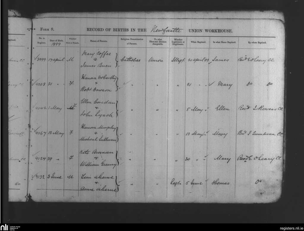 Newcastle Union Workhouse; County of Limerick; Diocese of Limerick. Baptisms, Apr. 1899 to June 1899