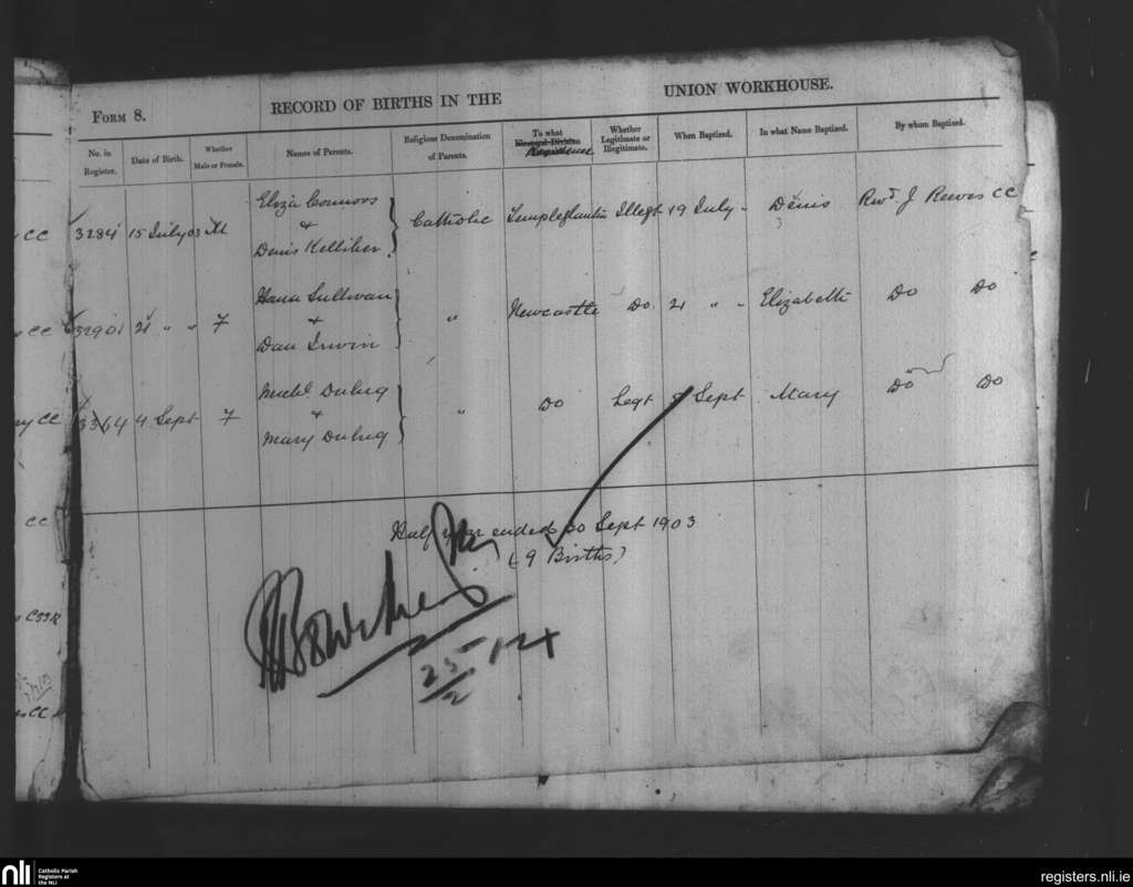 Newcastle Union Workhouse; County of Limerick; Diocese of Limerick. Baptisms, July 1903 to Sep. 1903