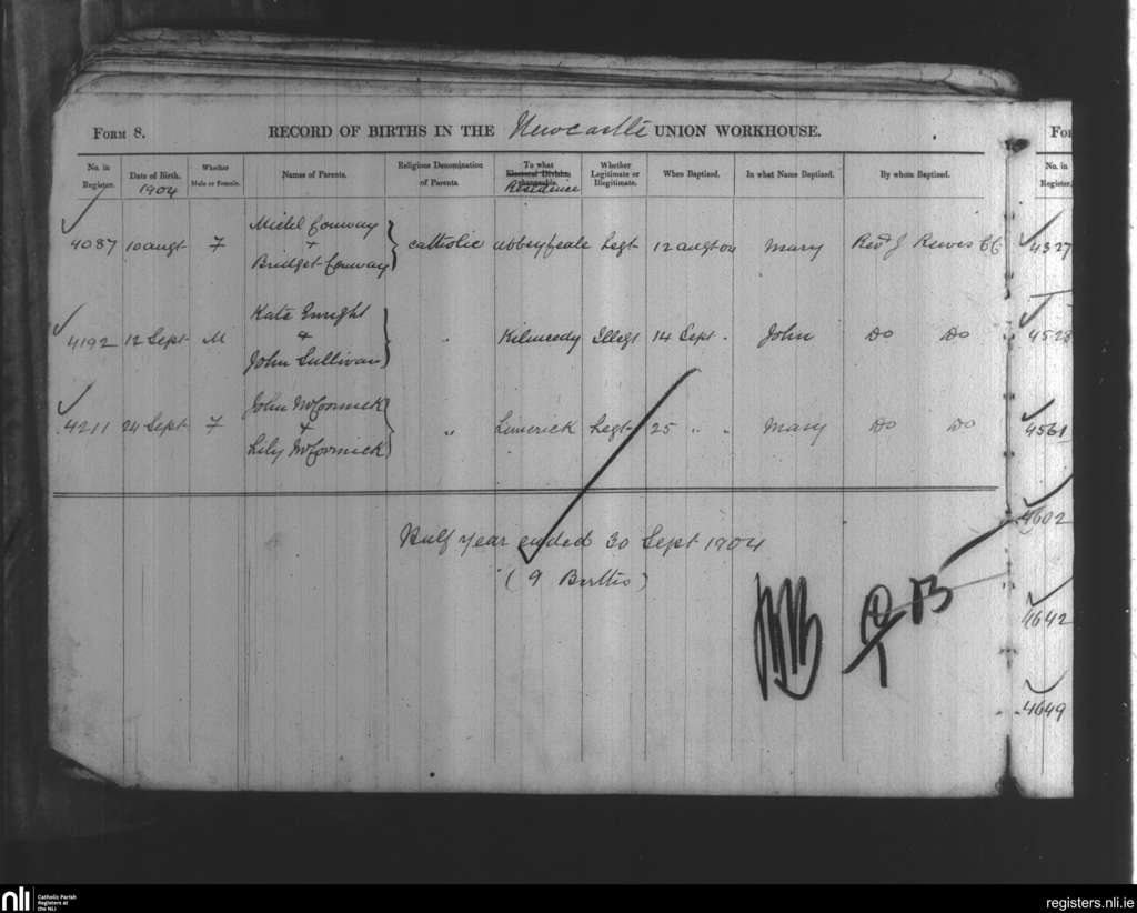 Newcastle Union Workhouse; County of Limerick; Diocese of Limerick. Baptisms, Aug. 1904 to Sep. 1904