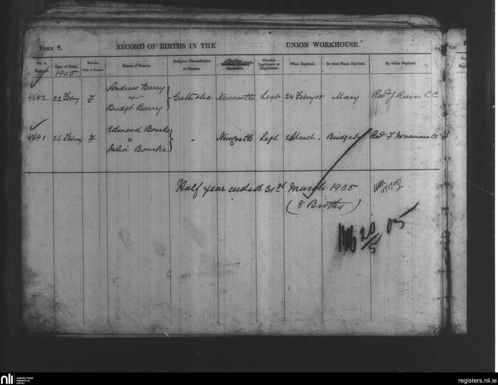 Newcastle Union Workhouse; County of Limerick; Diocese of Limerick. Baptisms, Feb. 1905 to Mar. 1905
