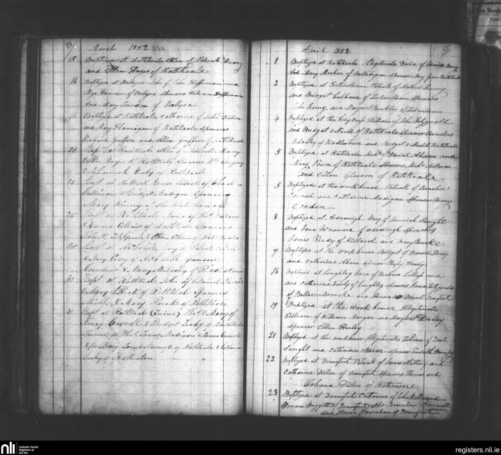 Rathkeale; County of Limerick; Diocese of Limerick. Baptisms, Mar. 1852 to Apr. 1852