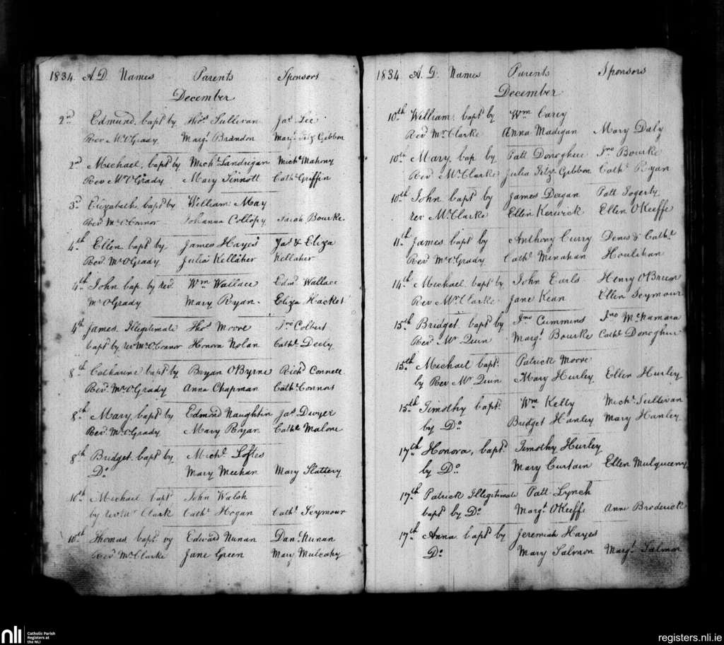 St. John's, Limerick city; County of Limerick; Diocese of Limerick. Baptisms, Dec. 1834