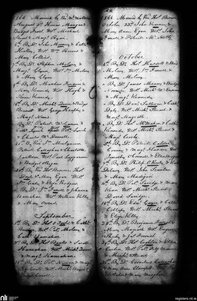 St. Michael's, Limerick city; County of Limerick; Diocese of Limerick. Marriages, Aug. 1866 to Oct. 1866
