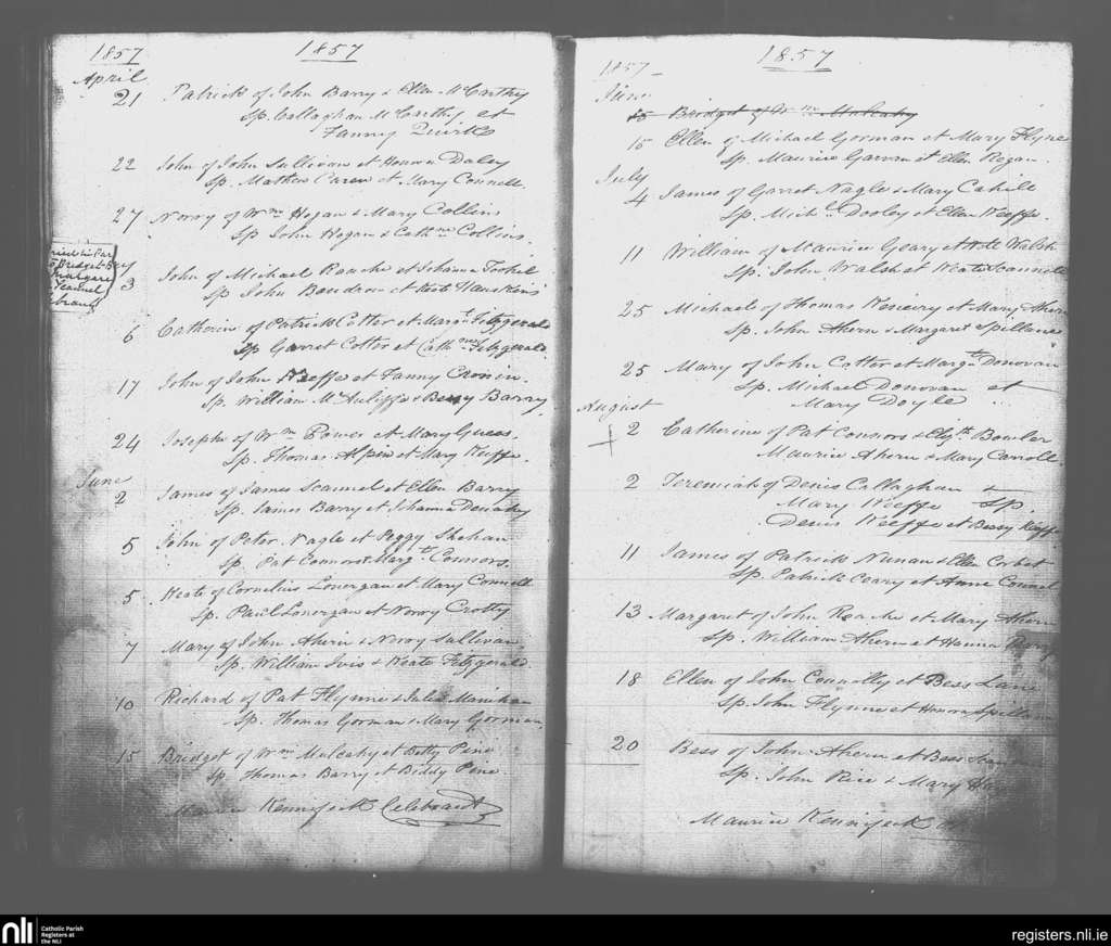 Rathcormack; County of Cork; Diocese of Cloyne. Baptisms, Apr. 1857 to Aug. 1857