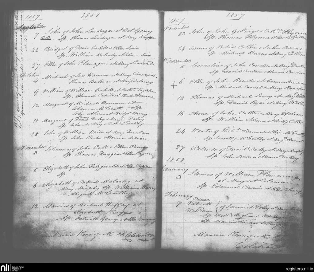 Rathcormack; County of Cork; Diocese of Cloyne. Baptisms, Sep. 1857 to Feb. 1858