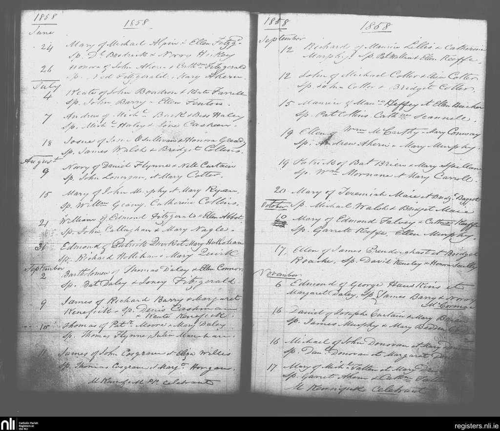 Rathcormack; County of Cork; Diocese of Cloyne. Baptisms, June 1858 to Nov. 1858
