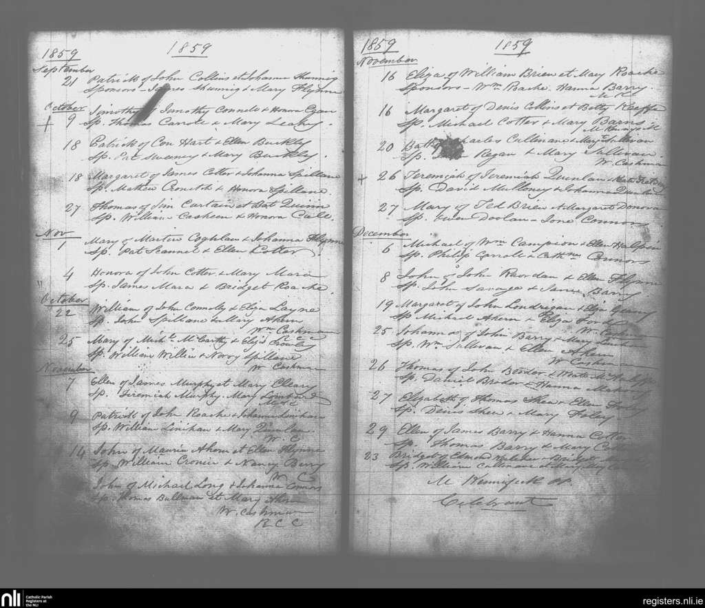 Rathcormack; County of Cork; Diocese of Cloyne. Baptisms, Sep. 1859 to Dec. 1859