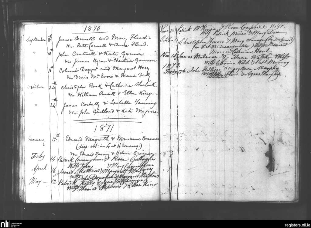 Ardcath; County of Meath; Diocese of Meath. Marriages, Aug. 1870 to Feb. 1872