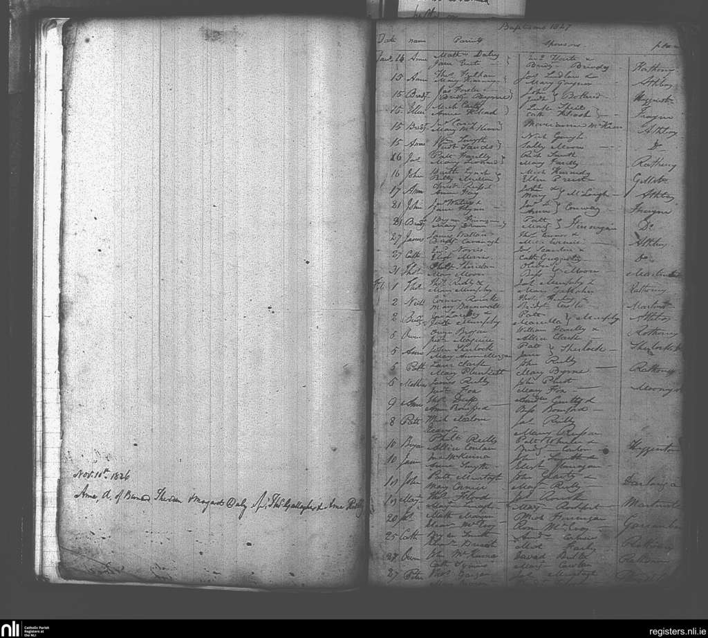 Athboy; County of Meath; Diocese of Meath. Baptisms, Nov. 1826 to Feb. 1827