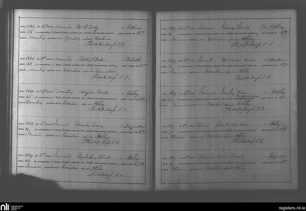 Athboy; County of Meath; Diocese of Meath. Deaths, Nov. 1868 to Feb. 1869
