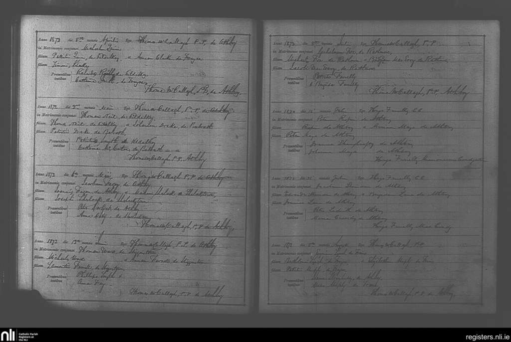 Athboy; County of Meath; Diocese of Meath. Marriages, Apr. 1872 to Aug. 1872
