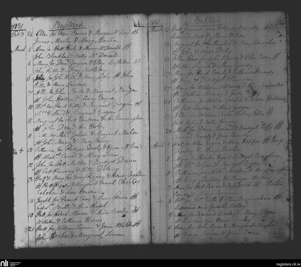Balliboy and Killoughy; County of Offaly; Diocese of Meath. Baptisms, Feb. 1821 to Apr. 1821