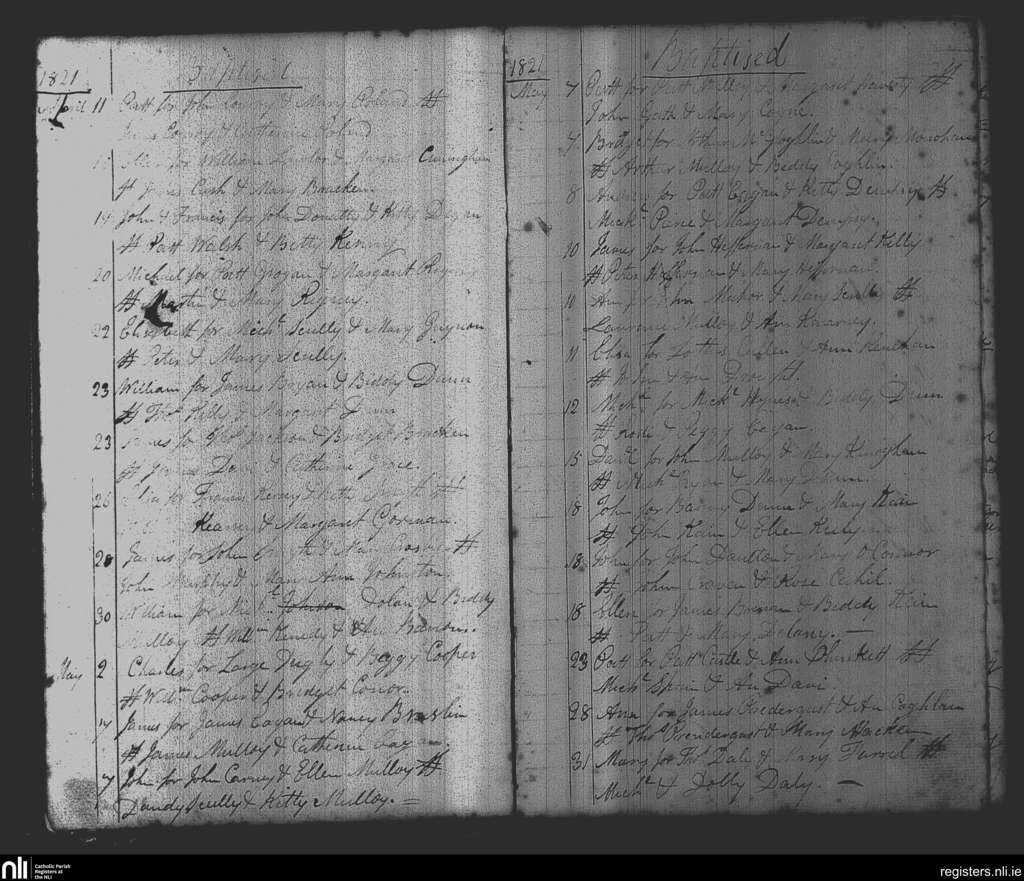 Balliboy and Killoughy; County of Offaly; Diocese of Meath. Baptisms, Apr. 1821 to May 1821