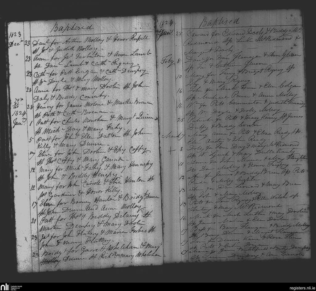 Balliboy and Killoughy; County of Offaly; Diocese of Meath. Baptisms, Dec. 1823 to Mar. 1824
