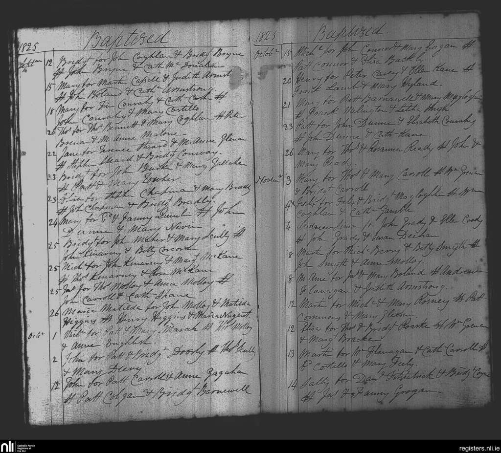 Balliboy and Killoughy; County of Offaly; Diocese of Meath. Baptisms, Sep. 1825 to Nov. 1825
