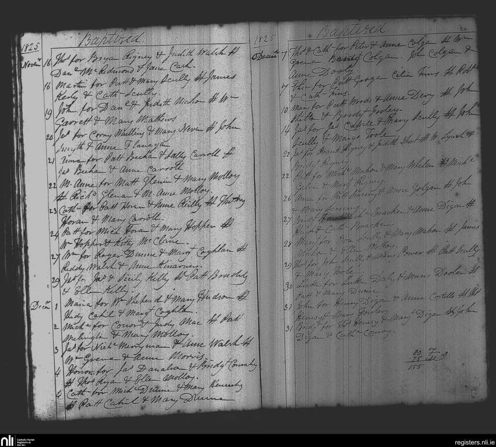 Balliboy and Killoughy; County of Offaly; Diocese of Meath. Baptisms, Nov. 1825 to Dec. 1825