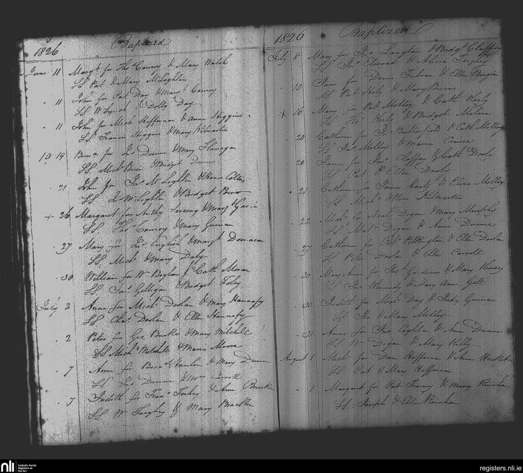 Balliboy and Killoughy; County of Offaly; Diocese of Meath. Baptisms, June 1826 to Aug. 1826