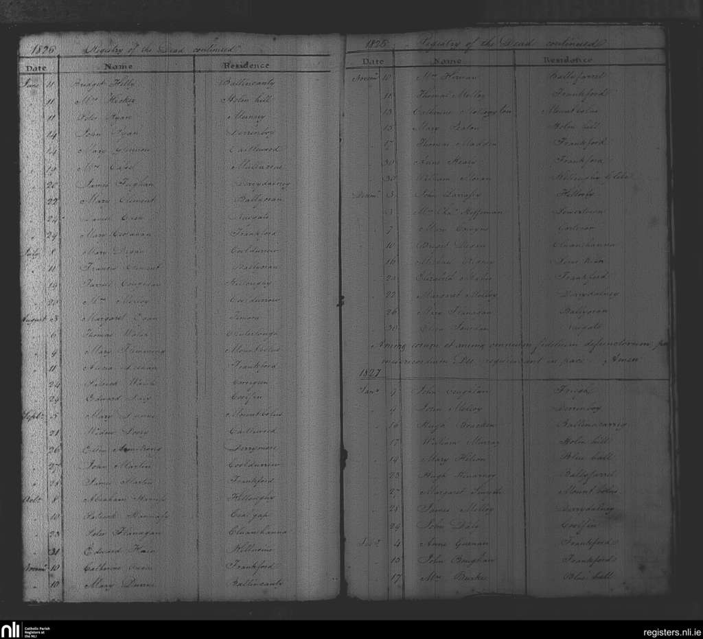 Balliboy and Killoughy; County of Offaly; Diocese of Meath. Deaths, June 1826 to Feb. 1827