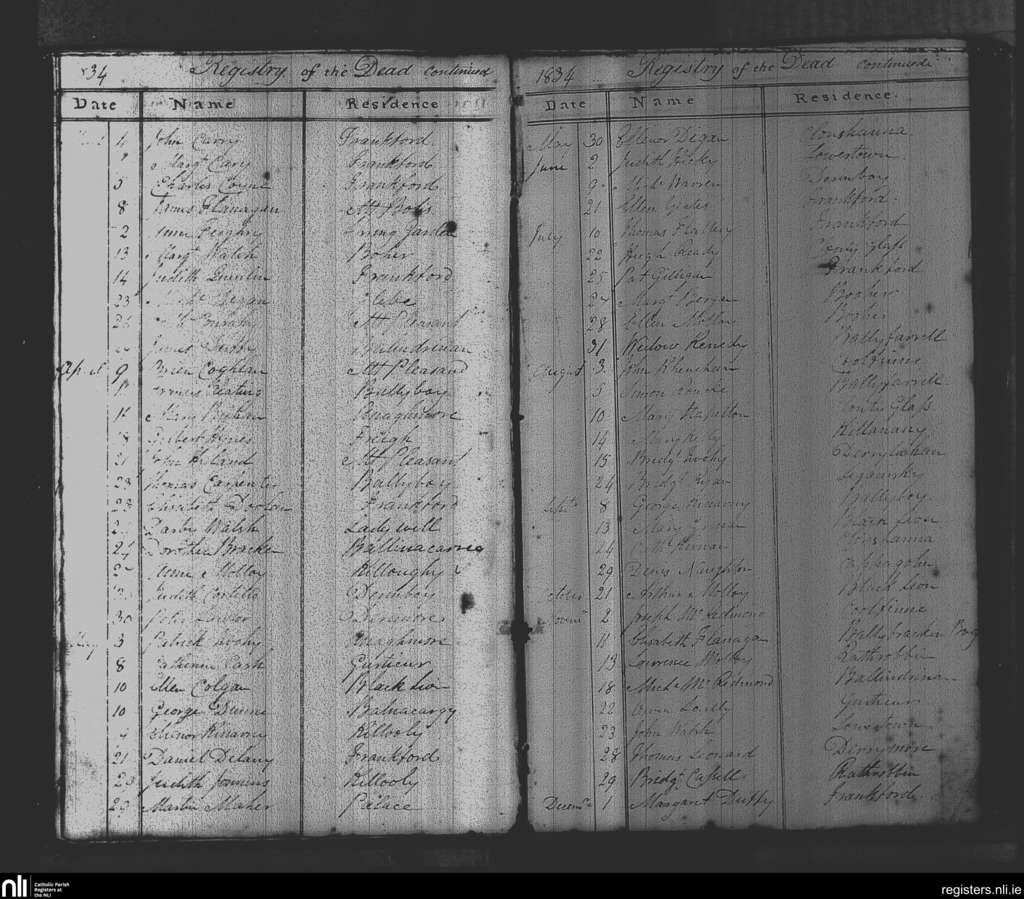 Balliboy and Killoughy; County of Offaly; Diocese of Meath. Deaths, Mar. 1834 to Dec. 1834