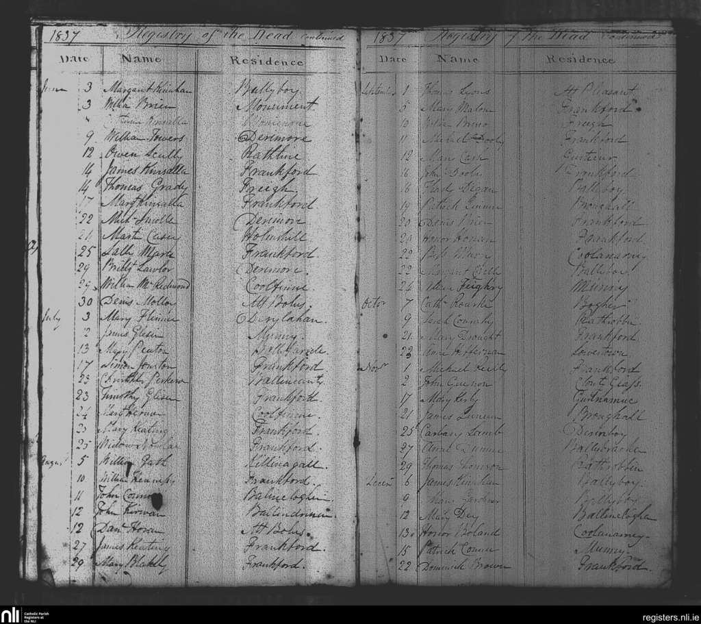 Balliboy and Killoughy; County of Offaly; Diocese of Meath. Deaths, June 1837 to Dec. 1837