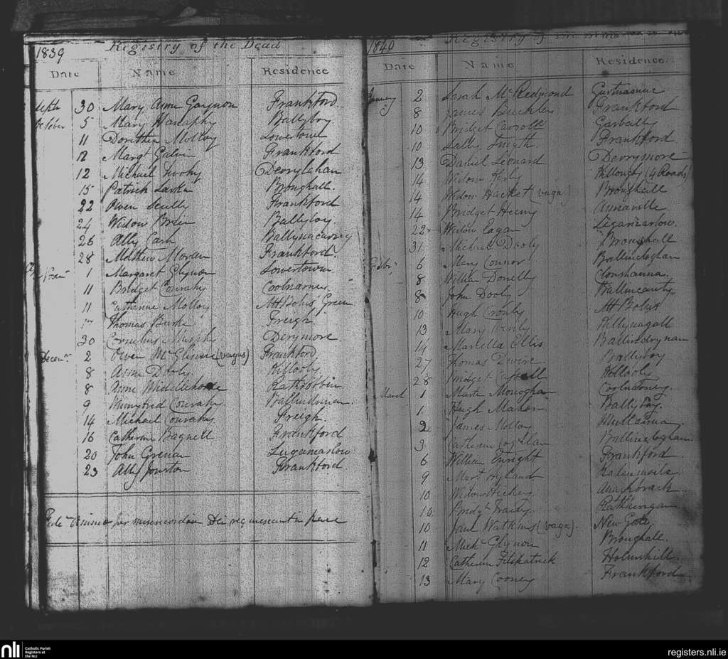 Balliboy and Killoughy; County of Offaly; Diocese of Meath. Deaths, Sep. 1839 to Mar. 1840