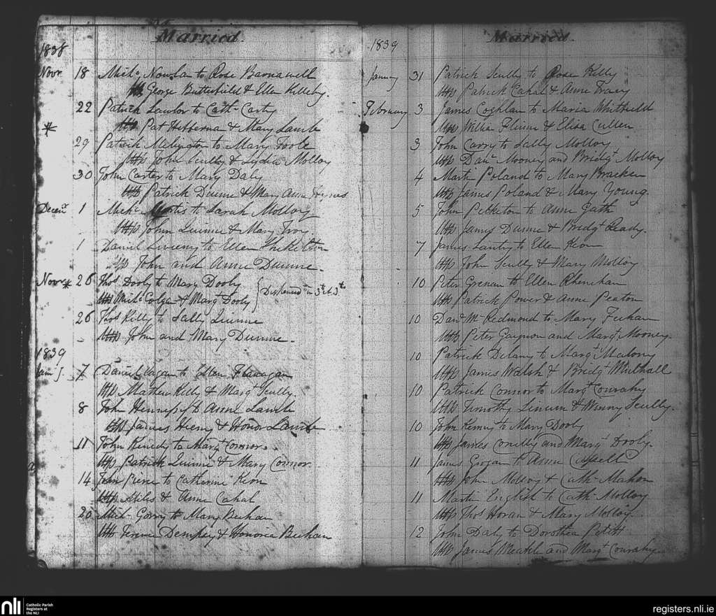 Balliboy and Killoughy; County of Offaly; Diocese of Meath. Marriages, Nov. 1838 to Feb. 1839