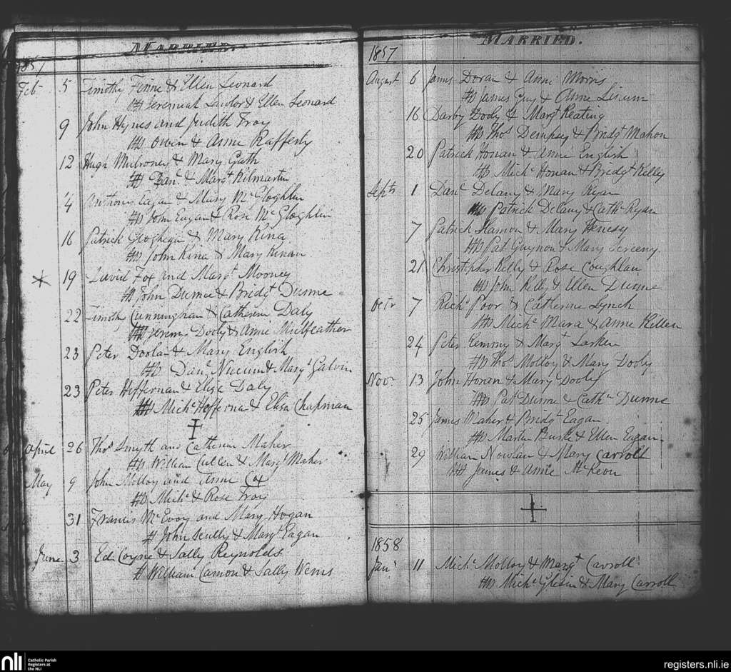 Balliboy and Killoughy; County of Offaly; Diocese of Meath. Marriages, Feb. 1857 to Jan. 1858