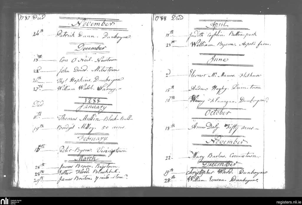 Dunboyne; County of Meath; Diocese of Meath. Deaths, Nov. 1787 to Dec. 1788