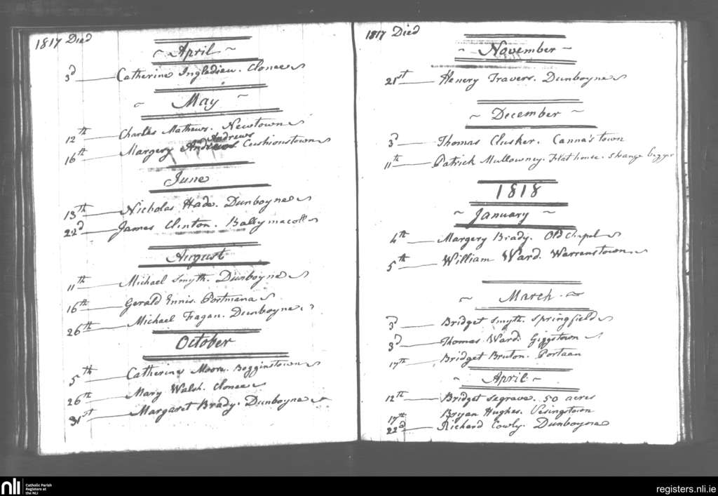 Dunboyne; County of Meath; Diocese of Meath. Deaths, Apr. 1817 to Apr. 1818