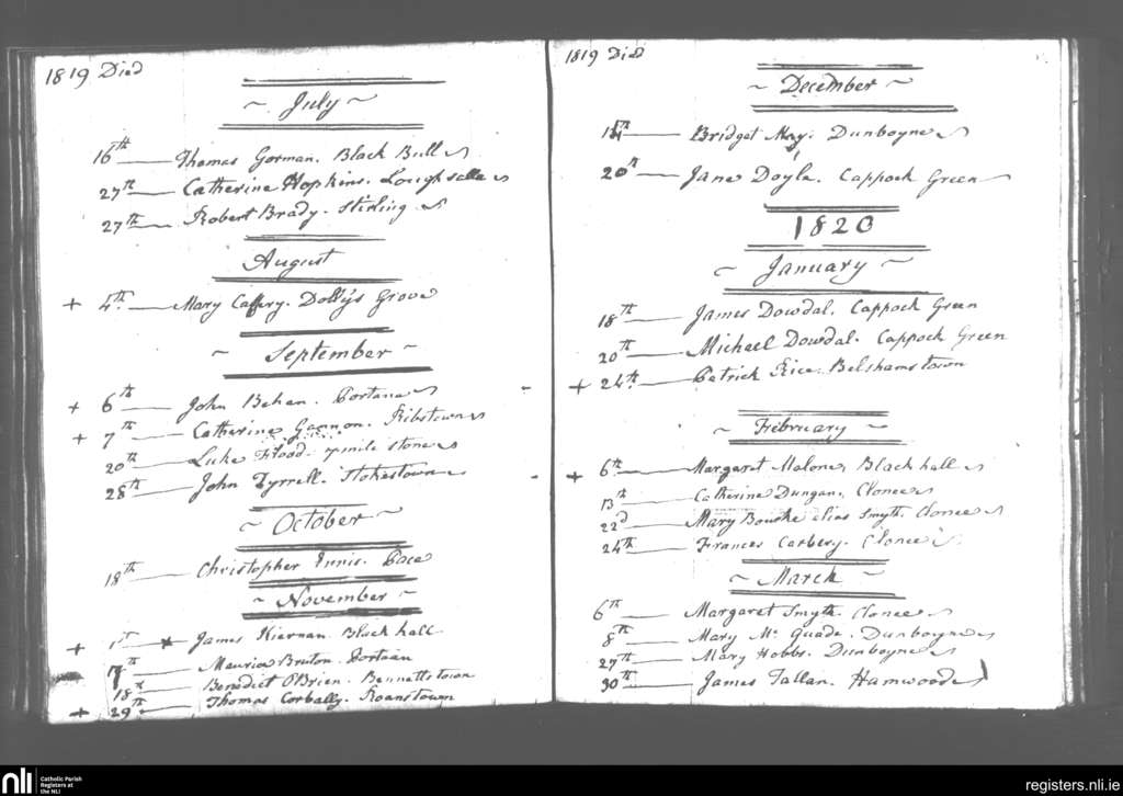 Dunboyne; County of Meath; Diocese of Meath. Deaths, July 1819 to Mar. 1820