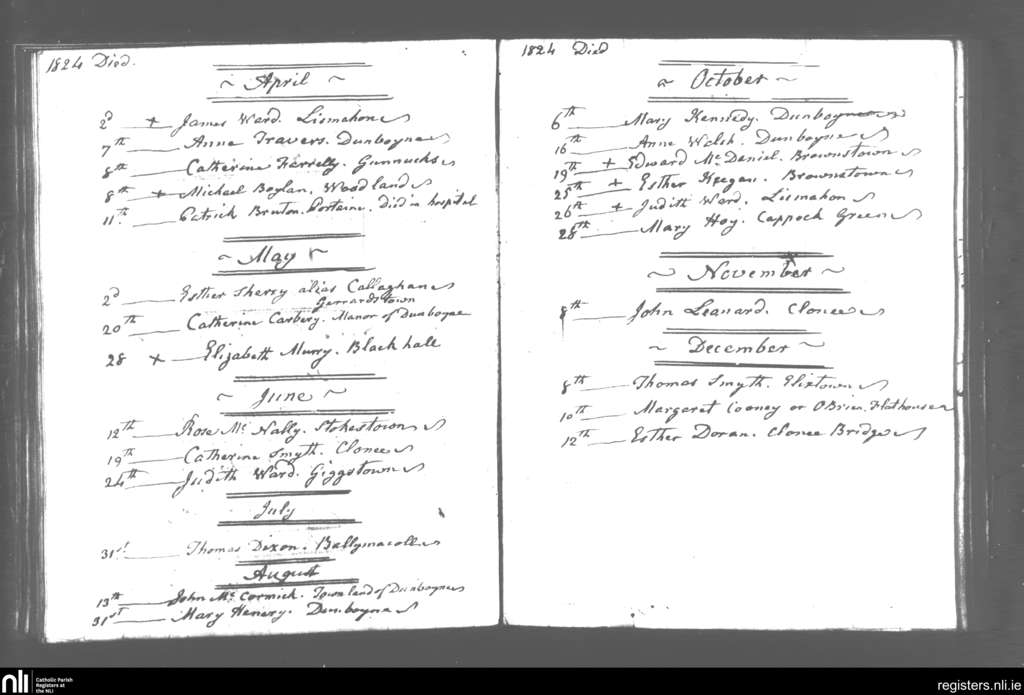 Dunboyne; County of Meath; Diocese of Meath. Deaths, Apr. 1824 to Dec. 1824