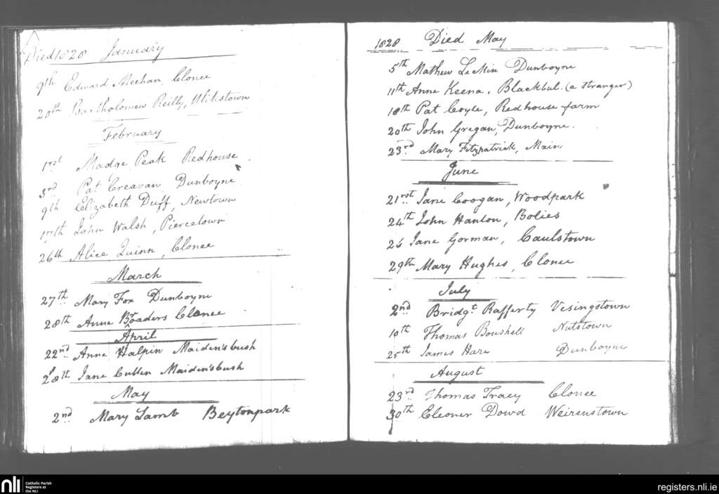 Dunboyne; County of Meath; Diocese of Meath. Deaths, Jan. 1828 to Aug. 1828