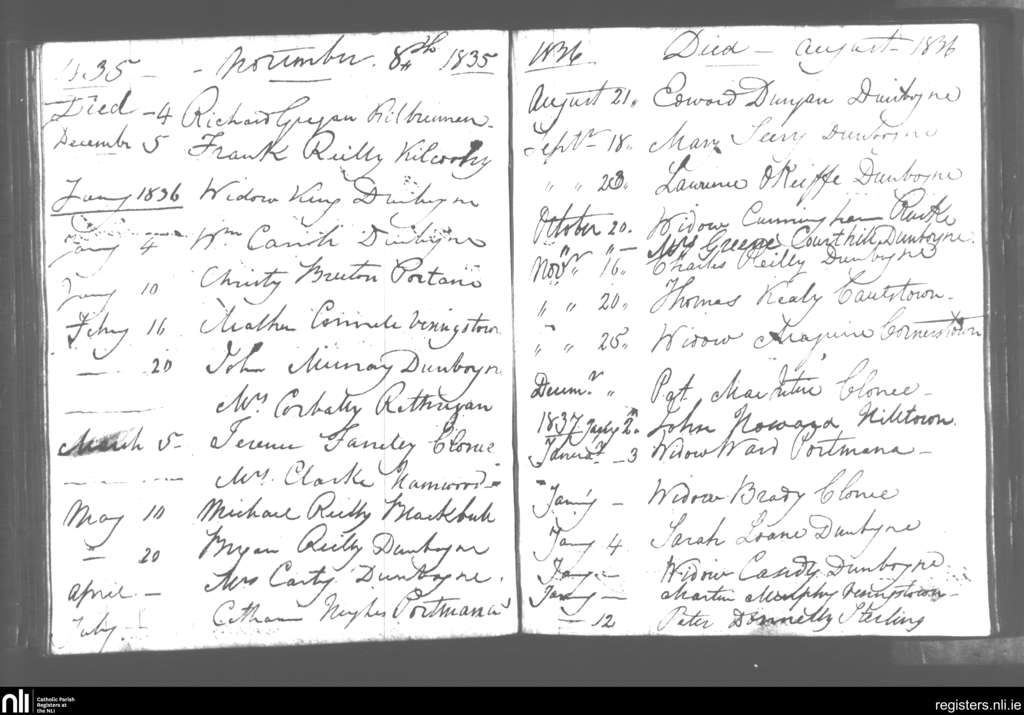 Dunboyne; County of Meath; Diocese of Meath. Deaths, Nov. 1835 to Jan. 1837