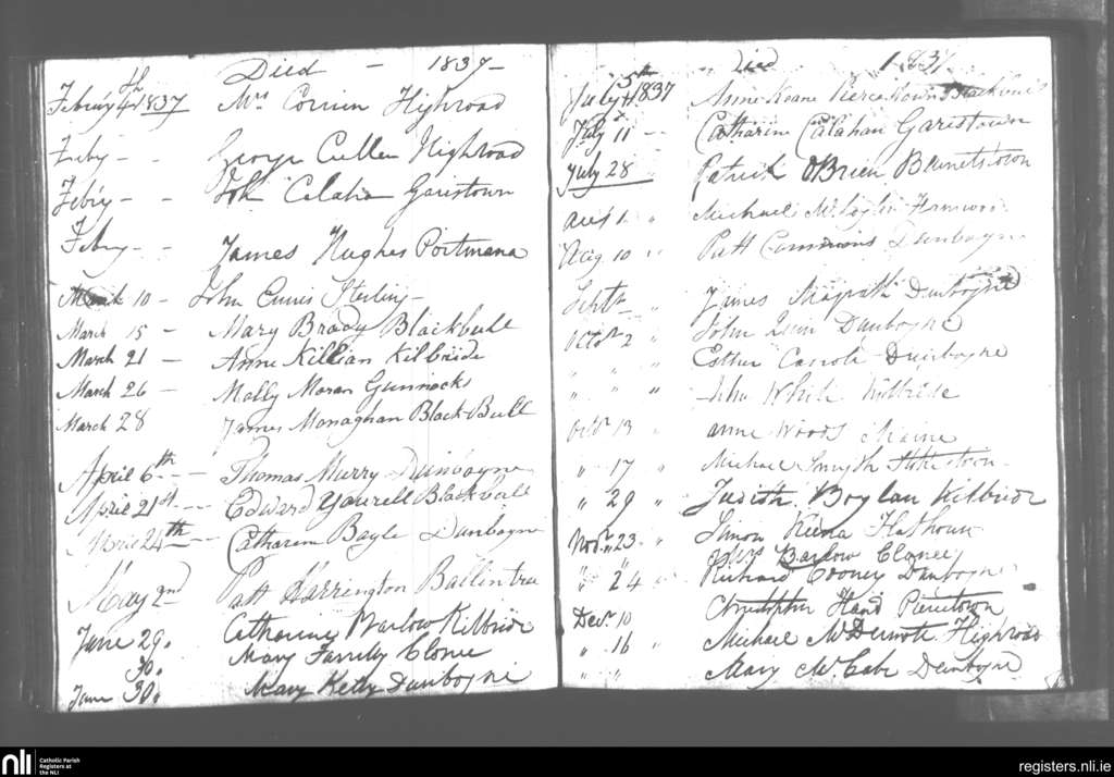 Dunboyne; County of Meath; Diocese of Meath. Deaths, Feb. 1837 to Dec. 1837