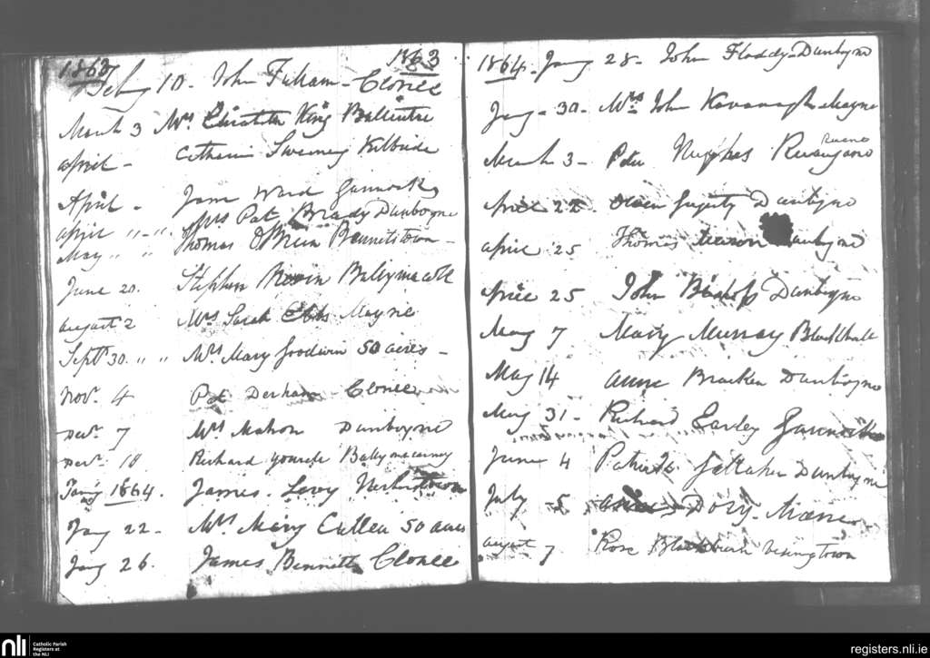 Dunboyne; County of Meath; Diocese of Meath. Deaths, Feb. 1863 to Aug. 1864