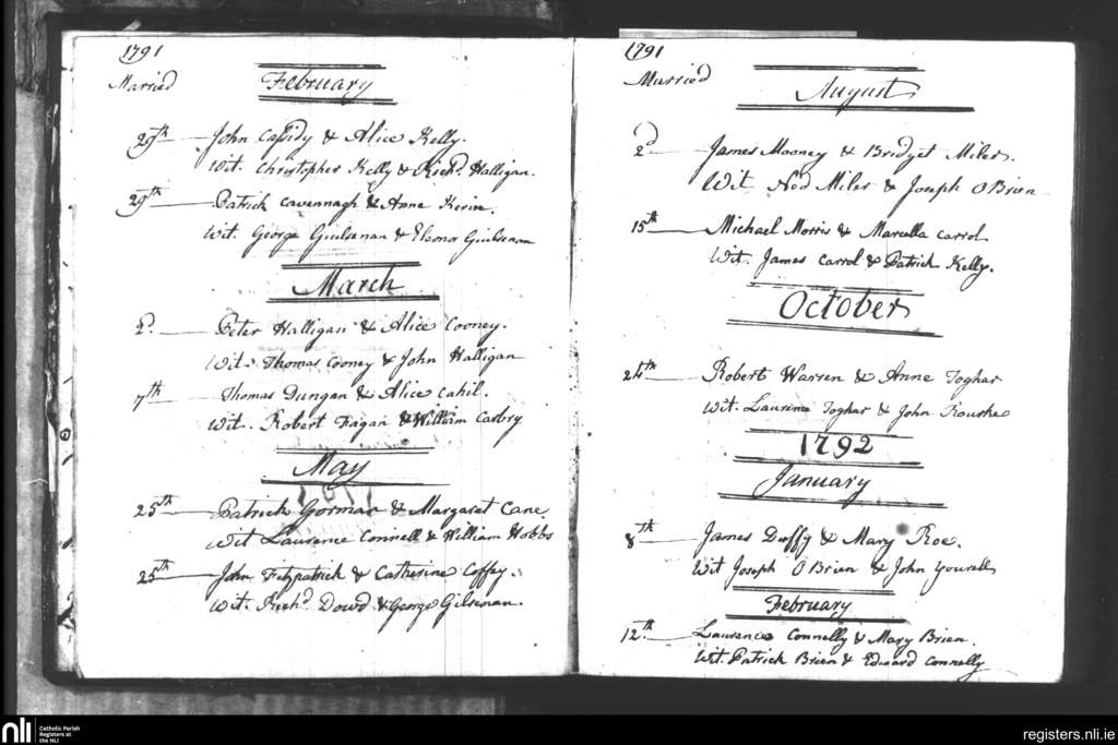 Dunboyne; County of Meath; Diocese of Meath. Marriages, Feb. 1791 to Feb. 1792