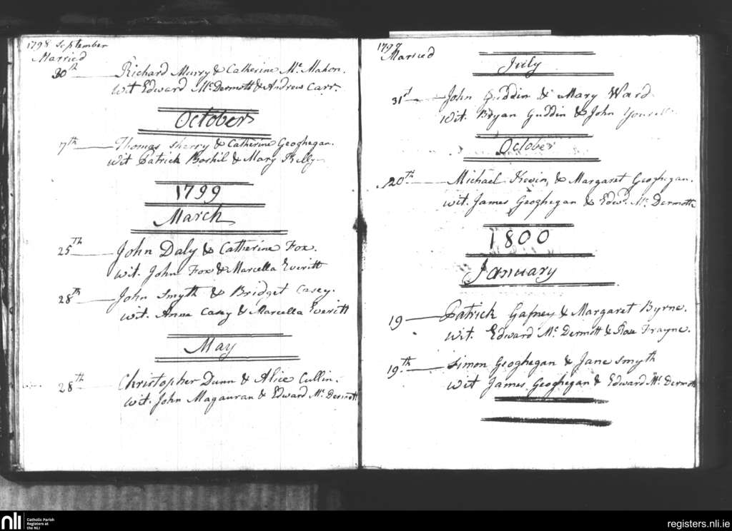 Dunboyne; County of Meath; Diocese of Meath. Marriages, Sep. 1798 to Jan. 1800