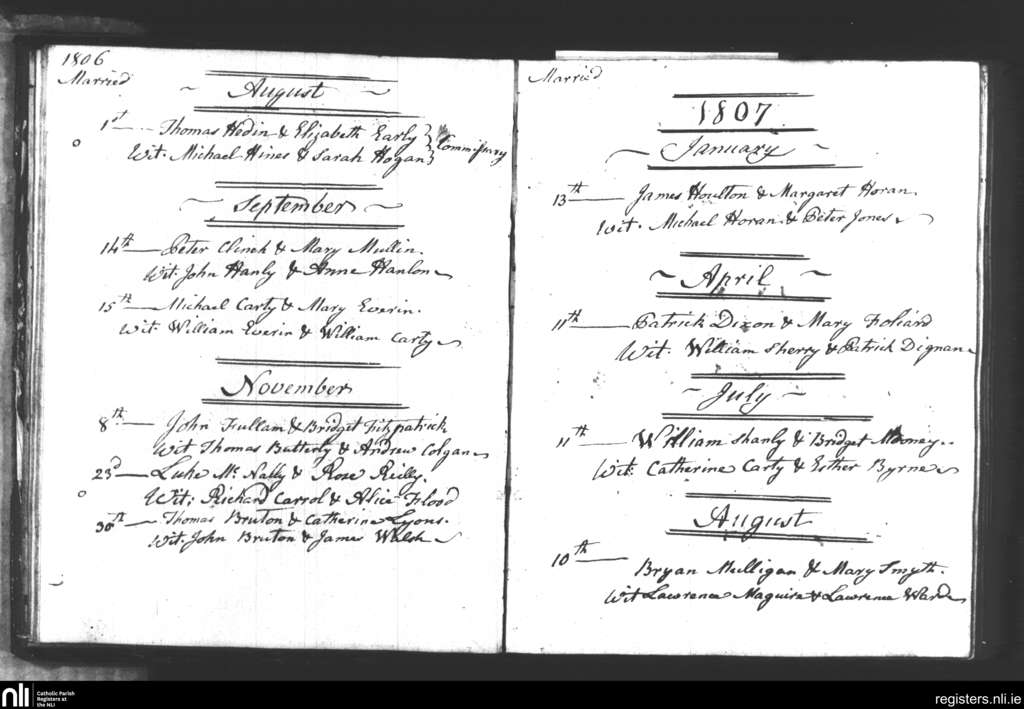 Dunboyne; County of Meath; Diocese of Meath. Marriages, Aug. 1806 to Aug. 1807