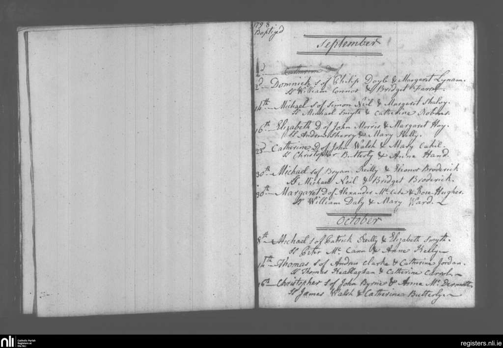 Dunboyne; County of Meath; Diocese of Meath. Baptisms, Sep. 1798 to Oct. 1798