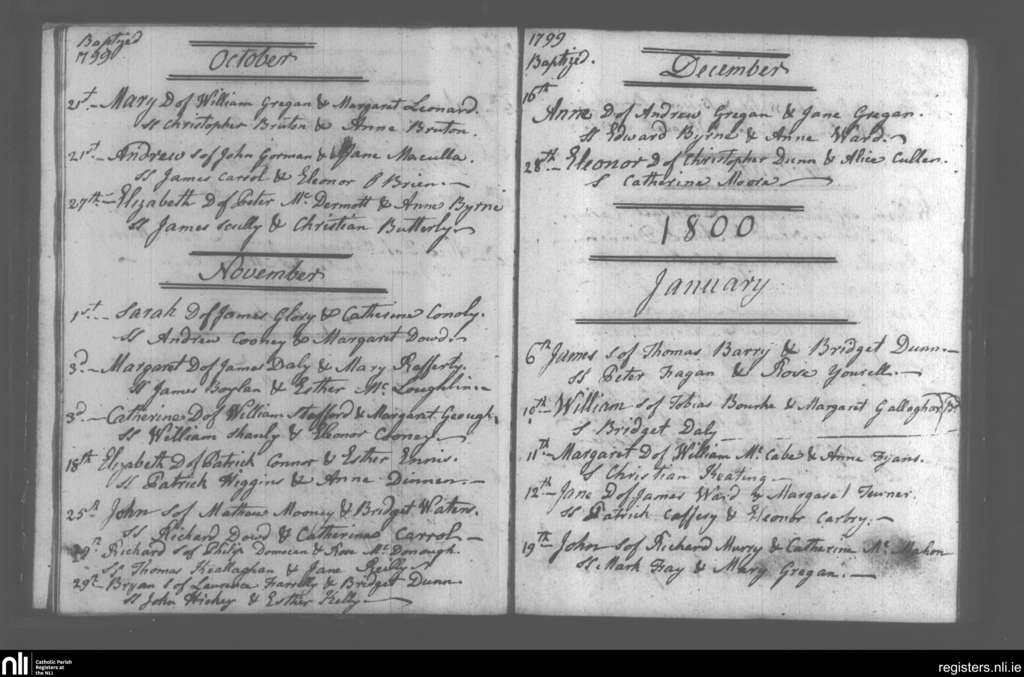 Dunboyne; County of Meath; Diocese of Meath. Baptisms, Oct. 1799 to Jan. 1800