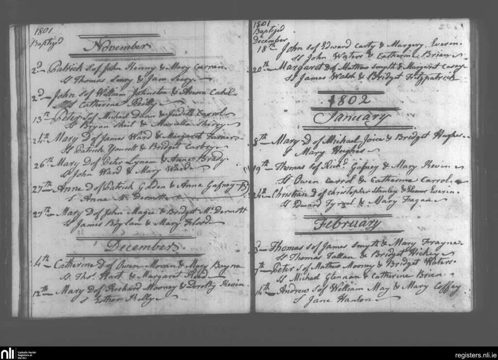 Dunboyne; County of Meath; Diocese of Meath. Baptisms, Nov. 1801 to Feb. 1802