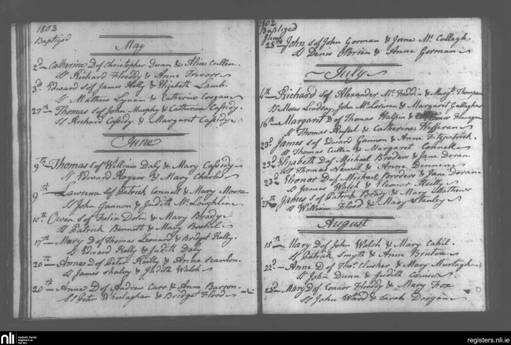 Dunboyne; County of Meath; Diocese of Meath. Baptisms, May 1802 to Aug. 1802