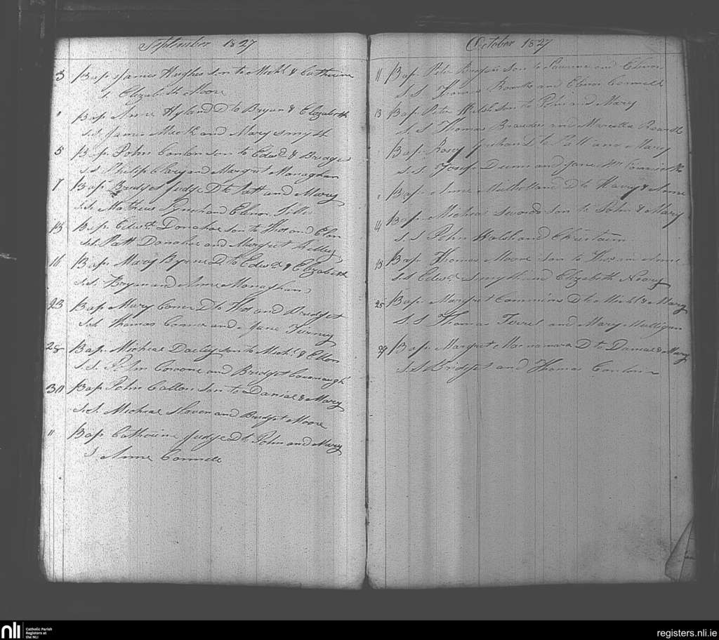 Castlejordan; County of Meath, Offaly; Diocese of Meath. Baptisms, Sep. 1827 to Oct. 1827