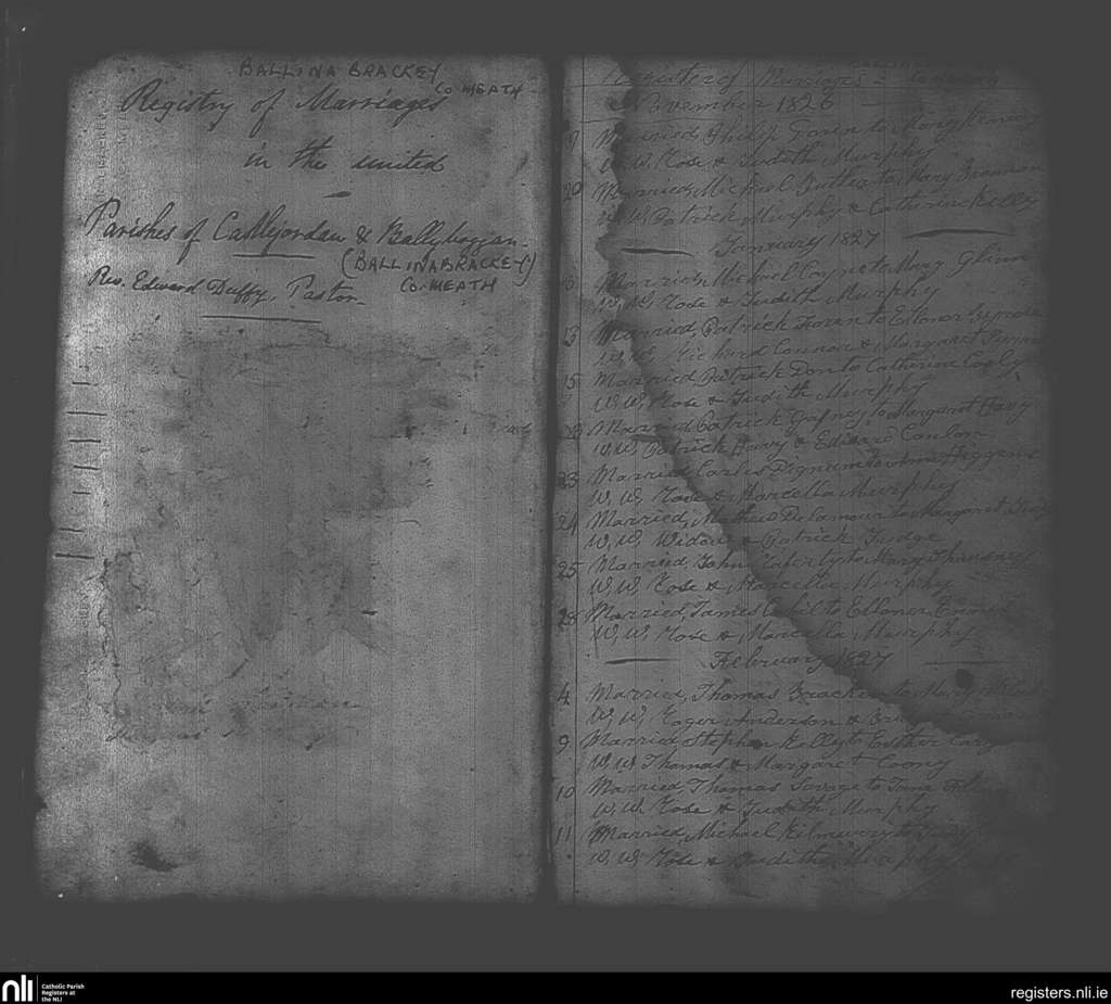 Castlejordan; County of Meath, Offaly; Diocese of Meath. Marriages, Nov. 1826 to Feb. 1827