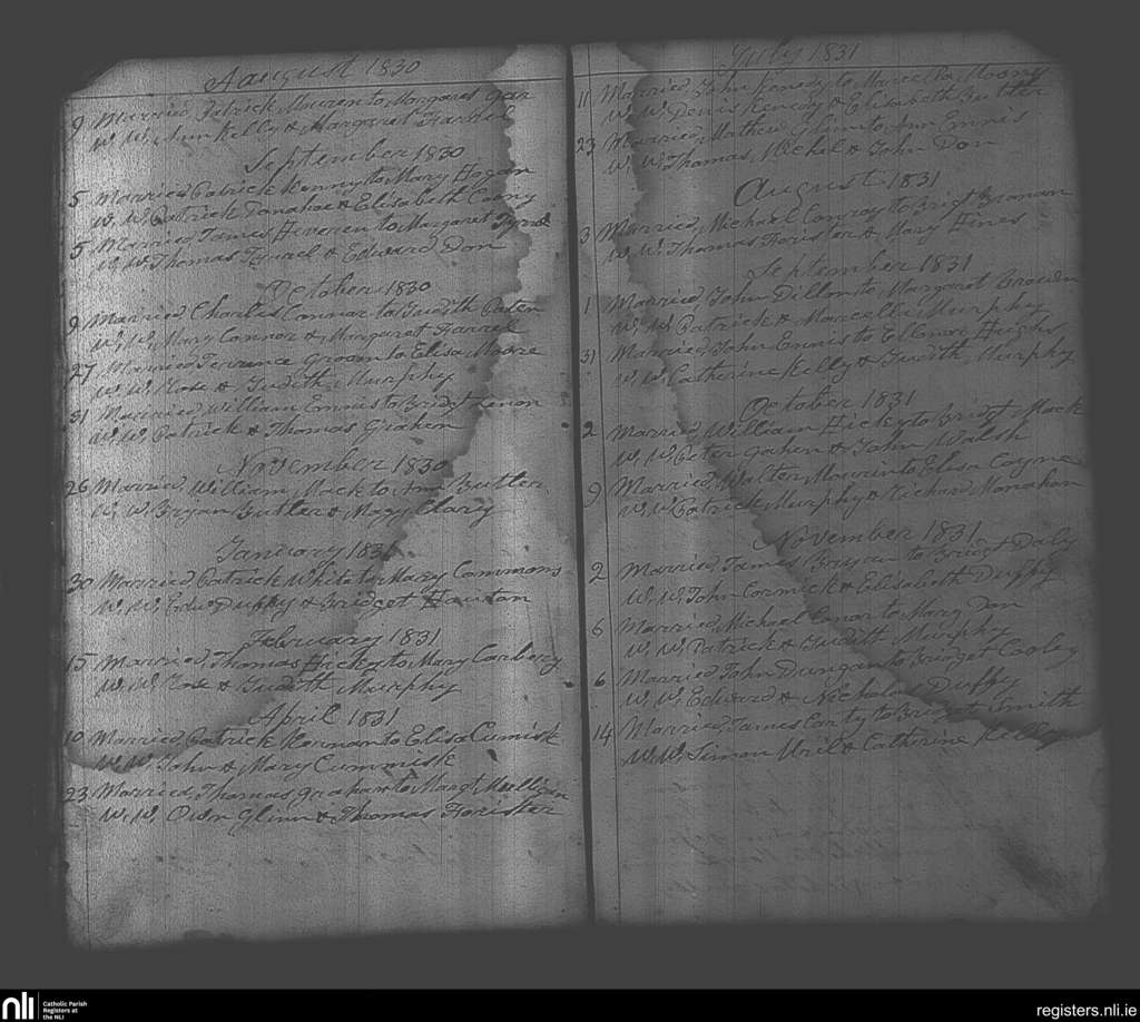 Castlejordan; County of Meath, Offaly; Diocese of Meath. Marriages, Aug. 1830 to Nov. 1831