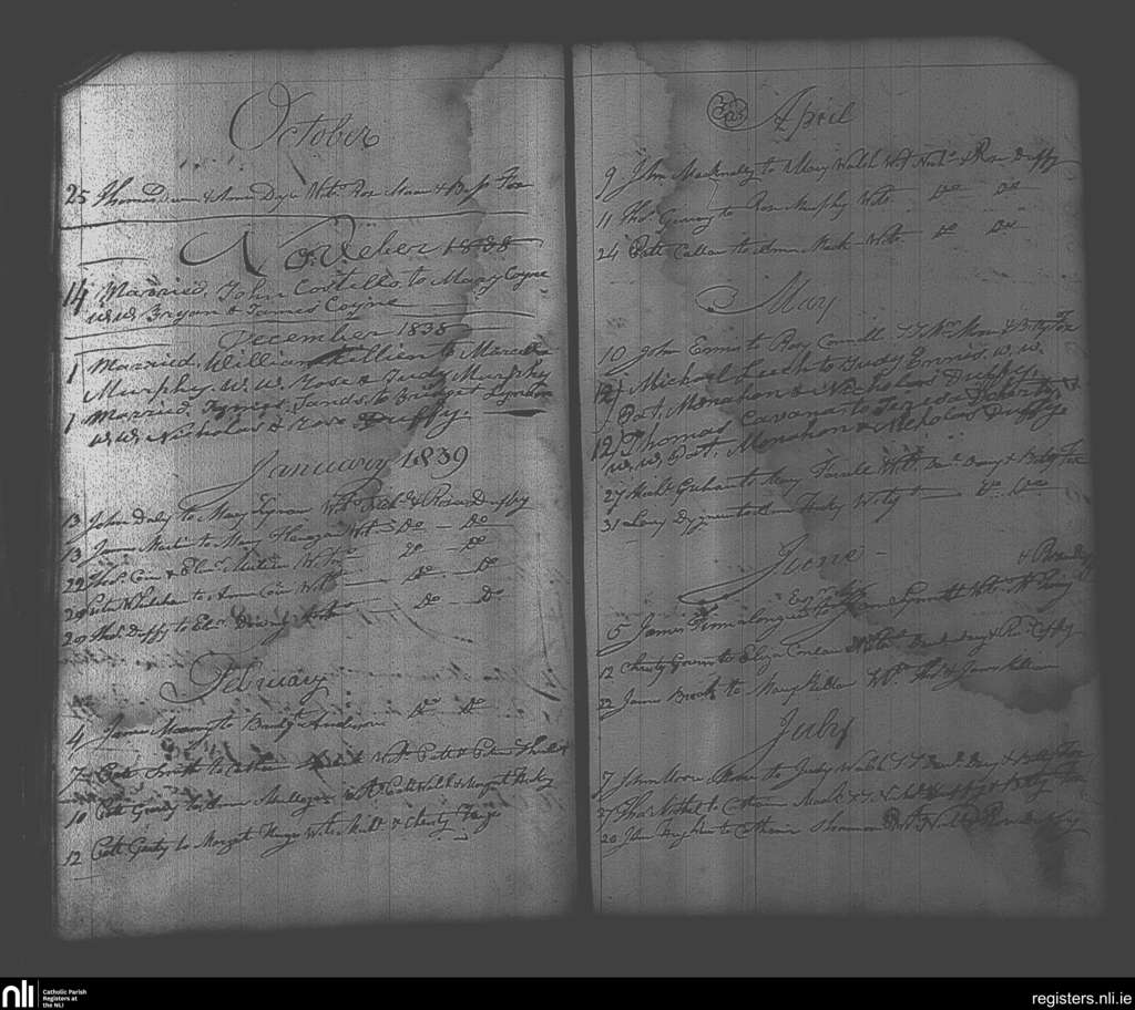 Castlejordan; County of Meath, Offaly; Diocese of Meath. Marriages, Oct. 1838 to July 1839