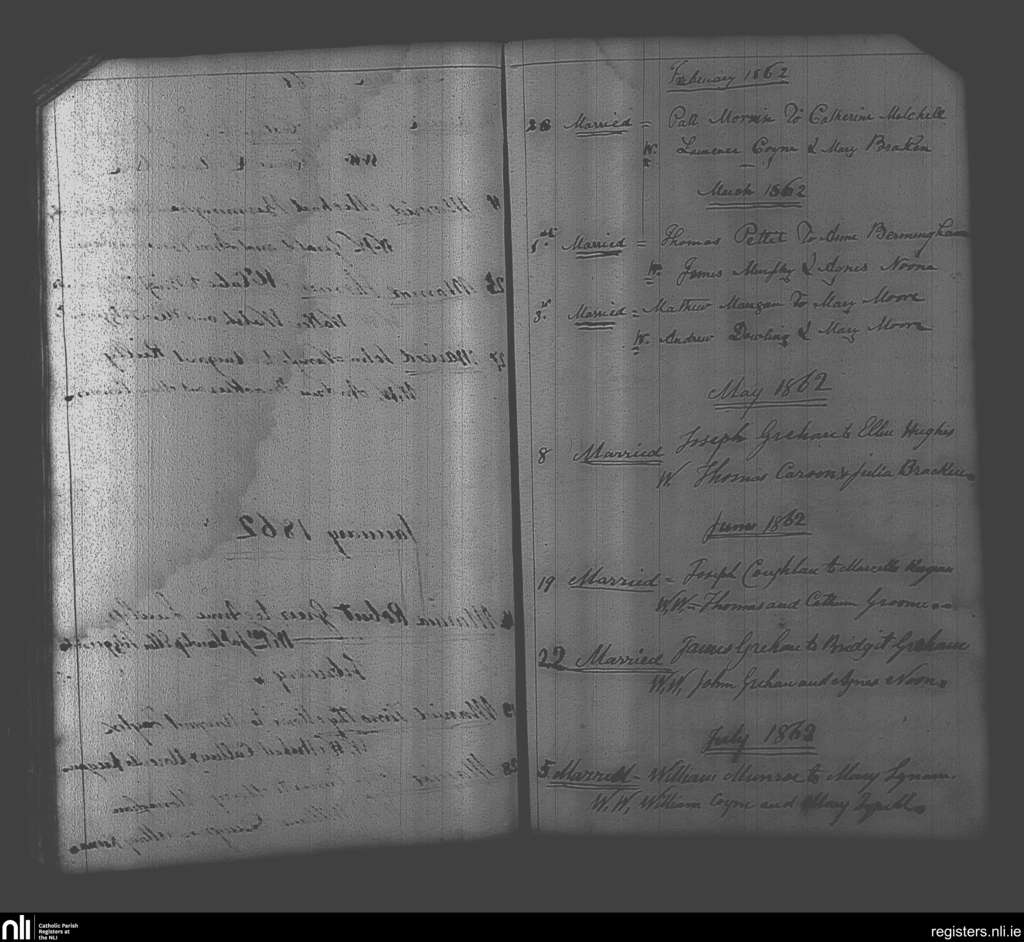 Castlejordan; County of Meath, Offaly; Diocese of Meath. Marriages, Feb. 1862 to July 1862