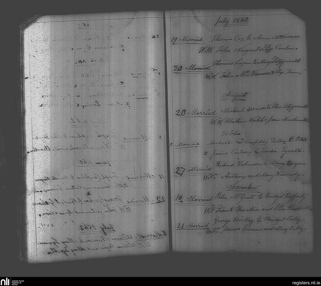 Castlejordan; County of Meath, Offaly; Diocese of Meath. Marriages, July 1862 to Nov. 1862